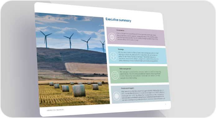 Executive summary Governance Allianz Global Investors (AllianzGI) Management and Supervisory Board members receive regular strategy updates of AllianzGI business and this includes a section on the latest strategic updates regarding sustainability, and climate change. Strategy We help our clients to reflect climate risks and opportunities in their holdings. In 2021 we adopted a firm-wide thermal coal exclusion policy for all mutual funds we manage. This section shows our innovative investment solutions, progress in sustainability research, policy advocacy, and our active industry and policy engagement. Risk management We have put in place further processes such as a tool for analysing sustainability risks and principal adverse impacts, including climate metrics. This section also includes information on climate scenario analysis and stress-testing. Metrics and targets After becoming a Net Zero Asset Managers (NZAM) initiative signatory in 2021, we submitted first interim targets at the beginning of 2022, reflecting the targets set in 2021 by Allianz for its proprietary assets. In addition, we have also committed to reducing our greenhouse gas footprint as a business, covering energy-related emissions, business travel and paper use. AllianzGI TCFD Report 2021 3
