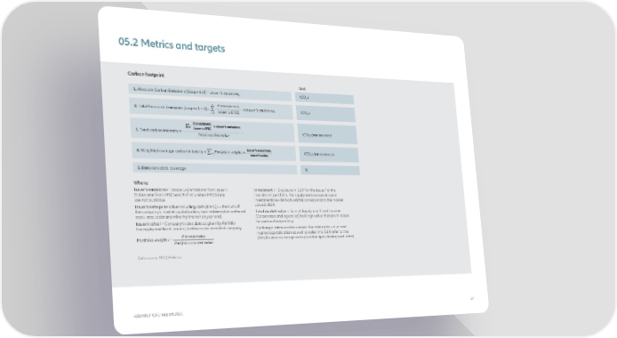 05.2 Metrics and targets Carbon footprint Unit 1. Absolute Carbon Emissions (Scope 1+2) =issuer's emissions tCO₂e i n € investmenti × issuer's emissions 2. Total Financed Emissions (scopes 1 + 2) = ∑ issuer's EVIC i tCO₂e i=1 i 3. Total carbon intensity = Total market value tCO₂e/mn invested n 4. Weighted average carbon intensity = ∑ Portfolio weighti × tCO₂e/mn revenues i=1 5. Emissions data coverage % Where: Issuer’s emissions i = scope 1+2 emissions from issuer i. Investment i = Exposure in EUR for the issuer i in the Data come from MSCI and Refinitiv when MSCI data investment portfolio. For equity and corporate bond are not available. investments (ex-derivatives) this corresponds to the market Issuer’s enterprise value including cash (EVIC) i = the sum of value in EUR. the company’s market capitalization, non-redeemable preferred Total market value = Sum of Equity and Fixed Income stock, total debt and minority interest at year end. (Corporates and Agencies) holdings value that are in scope Issuer’s sales i = Company’s sales data as given by Refinitiv. for carbon footprinting. For equity and fixed income, it refers to the identified company. Exchange rates used to convert the enterprise value and € investmenti market capitalisation as well as sales into EUR refer to the Portfolio weight i = WM/Reuters exchange rates (London 4pm closing spot rates). Portfolio market value Data source: MSCI/Refinitiv AllianzGI TCFD Report 2021 27