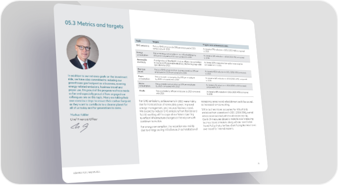 05.3 Metrics and targets Topic Targets Progress and achievements 2021 GHG emissions Reduce GHG emissions by 38% per employee by 2025 Achieved a 77% reduction in 2021 (2020: 46%) compared compared with 2019. to 2019. Energy Reduce energy consumption in our office buildings by Achieved a 22% reduction in 2021 (2020: 9%) compared consumption 10% per employee by 2025 compared with 2019. to 2019. Renewable As a signatory of the RE100 initiative, Allianz has committed Achieved 100% renewable, low-carbon electricity for electricity to source 100% renewable electricity (RE) for its group-wide our operations in 2021. operations by 2023. Business Reduce GHG emissions from business travel by 20% per Achieved a 81% reduction in 2021 (2020: 76%) compared travel employee by 2025 compared with 2019. to 2019. In addition to our net-zero goals on the investment Paper Reduce paper consumption by 20% per employee Achieved a 66% reduction in 2021 (2020: 29%) compared side, we have also committed to reducing our consumption by 2025 compared with 2019. to 2019. greenhouse gas footprint as a business, covering Water Reduce water consumption by 15% per employee Achieved a 4% reduction in 2021 (2020: a 36% increase) energy-related emissions, business travel and consumption by 2025 compared with 2019. compared to 2019. paper use. I’m proud of the progress we have made Waste Reduce waste by 14% per employee by 2025 compared Achieved a 49% reduction in 2021 (2020: 40%) compared so far and especially proud of how engaged our with 2019. to 2019. colleagues are on this topic. Many are taking their own conscious steps to reduce their carbon footprint For GHG emissions, achievements in 2021 were mainly occupancy sensors and refurbishment activities as well as they want to contribute to a cleaner planet for due to increased use of renewable power, improved as increased remote working. all of us today and for generations to come. energy management, and reduced business travel. While business travel accounted for 40% of GHG We expect to include GHG emissions from flexible and emissions from operations in 2021 (2020: 25%), overall Markus Kobler hybrid working within scope of our future reporting emissions associated with travel are decreasing. Chief Financial Officer to reflect infrastructure changes as the way we work Covid-19 measures played a material role in reducing continues to evolve. business travel emissions along with our new Global For energy consumption, the reduction was mainly Travel Policy that prioritises client-facing business travel due to energy-saving initiatives such as installation of over travel for internal reasons. AllianzGI TCFD Report 2021 31
