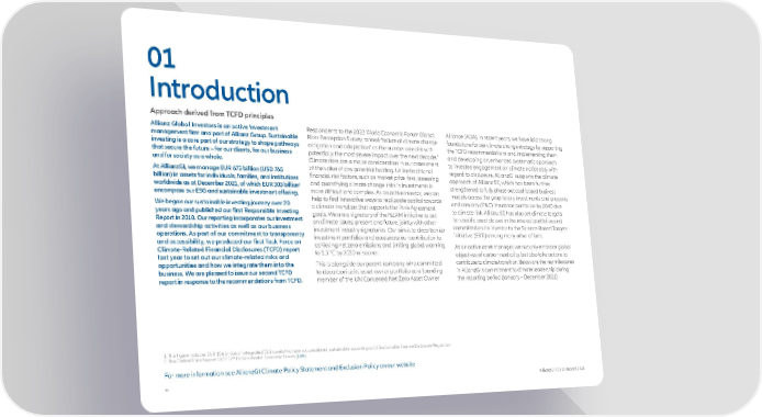 01 Introduction Approach derived from TCFD principles Allianz Global Investors is an active investment Respondents to the 2022 World Economic Forum Global Alliance (AOA). In recent years, we have laid strong management firm and part of Allianz Group. Sustainable Risks Perception Survey ranked “failure of climate change foundations for our climate change strategy by supporting investing is a core part of our strategy to shape pathways mitigation and adaptation” as the number one risk with the TCFD recommendations and implementing them that secure the future – for our clients, for our business potentially the most severe impact over the next decade.2 and developing an enhanced systematic approach and for society as a whole. Climate risks are a major consideration in our assessment to investee engagement on climate noticeably with At AllianzGI, we manage EUR 673 billion (USD 765 of the value of any potential holding. Unlike traditional regard to disclosure. AllianzGI supports the climate billion) in assets for individuals, families, and institutions financial risk factors, such as market price risks, assessing approach of Allianz SE, which has been further 1 and quantifying climate change risks in investments is worldwide as at December 2021, of which EUR 303 billion more difficult and complex. As an active investor, we can strengthened to fully phase out coal-based business encompass our ESG and sustainable investment offering. models across the proprietary investments and property We began our sustainable investing journey over 20 help to find innovative ways to reallocate capital towards and casualty (P&C) insurance portfolios by 2040 due years ago and published our first Responsible Investing a climate transition that supports the Paris Agreement to climate risk. Allianz SE has also set climate targets Report in 2018. Our reporting incorporates our investment goals. We are a signatory of the NZAM initiative to act for specific asset classes in the insured portfolios and and stewardship activities as well as our business on climate issues, present and future, jointly with other committed as an investor to the Science Based Targets operations. As part of our commitment to transparency investment industry signatories. Our aim is to decarbonise initiative (SBTi) among many other efforts. and accessibility, we produced our first Task Force on investment portfolios and accelerate our contribution to Climate-Related Financial Disclosures (TCFD) report achieving net zero emissions and limiting global warming As an active asset manager, we not only embrace global last year to set out our climate-related risks and to 1.5 °C by 2050 or sooner. objectives of carbon neutrality, but also take actions to opportunities and how we integrate them into the This is alongside our parent company, who committed contribute to climate transition. Below are the key milestones business. We are pleased to issue our second TCFD to decarbonise its asset owner portfolio as a founding in AllianzGI’s commitment to climate leadership during report in response to the recommendations from TCFD. member of the UN Convened Net-Zero Asset Owner the reporting period (January – December 2021): 1. This figure includes EUR 156 billion of integrated ESG assets that are not considered sustainable according to EU Sustainable Finance Disclosure Regulation th 2. The Global Risks Report 2022 17 Edition Workd Economic Forum (Link) For more information see AllianzGI Climate Policy Statement and Exclusion Policy on our website 4 AllianzGI TCFD Report 2021