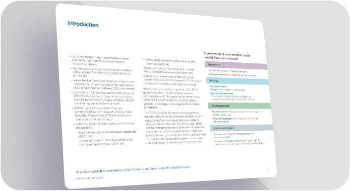 Introduction Core elements of recommended climate- related financial disclosures* – Launched three strategic sustainability themes: – Carbon offsets: debate to define role in net zero, Governance climate change, planetary boundaries and December 2021 (Link) inclusive capitalism. – Added new policy on “Say on Climate” under our Climate-related issues in board oversight – Thermal coal (and controversial weapons) exclusion Global Corporate Governance Guideline (Link) Management’s role in assessment and management policy adopted firm-wide for all mutual funds that – Hosted major events such as AllianzGI Global we manage. Sustainability Days (24-25 November 2021) to provide Strategy – Joined the Net Zero Asset Managers initiative and clients with information and insights on climate submitted first interim targets at the beginning of Risk identification 2022 to help meet our net-zero 2050 commitment. AllianzGI became an official supporter of the TCFD Over the short, medium and long term – Launched a “Climate Engagement with Outcome recommendations in 2019 following its parent Impact of climate issues (CEWO)” investment strategy, where we engage company Allianz SE. This report follows the structure On business, strategy and financial planning with the top emitters to reduce emissions without of the TCFD recommendations along four pillars: resilience considering different climate scenarios constraining the investment universe. governance, strategy, risk management and metrics Risk management – Joined the One Planet Asset Managers and targets. (OPAM) initiative, which supports the One Planet The TCFD’s four-pillar framework provides guidance Processes for identifying, assessing and managing Sovereign Wealth Funds (OPSWF) to tackle the for companies on how to consistently disclose risks and climate-related risks challenges of climate change. opportunities from a changing climate as well as to How it is integrated into the organisation’s overall – Published three thematic papers on the climate integrate them into their business. We strongly believe risk management change topic that, for investors to be able to make informed decisions, Metrics and targets – Are all net-zero goals created equal?, September companies must report comprehensively on how they 2021 (Link) tackle dominant global long-term trends, such as climate Metrics used in climate change strategy and – Oil and gas majors: active stewardship rather change. AllianzGI advocates for greater transparency risk management than divestment, October 2021 (Link) and reporting on climate change risks by companies. Disclosure of climate-related targets (including both investment-related and operation-related climate targets) *Implementing the Recommendations of the Task Force on Climate-related Financial Disclosures AllianzGI TCFD Report 2021 5