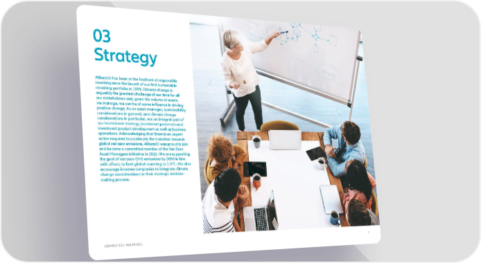 03 Strategy AllianzGI has been at the forefront of responsible investing since the launch of our first sustainable investing portfolio in 1999. Climate change is arguably the greatest challenge of our time for all our stakeholders and, given the volume of assets we manage, we can be of some influence in driving positive change. As an asset manager, sustainability considerations in general, and climate change considerations in particular, are an integral part of our investment strategy, investment processes and investment product development as well as business operations. Acknowledging that there is an urgent action required to accelerate the transition towards global net zero emissions, AllianzGI was proud to join and become a committed member of the Net Zero Asset Managers initiative in 2021. We are supporting the goal of net-zero GHG emissions by 2050 in line with efforts to limit global warming to 1.5°C. We also encourage investee companies to integrate climate change considerations in their strategic decision- making process. AllianzGI TCFD Report 2021 7