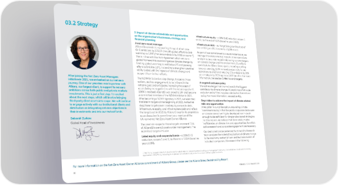 03.2 Strategy 2. Impact of climate-related risks and opportunities Infrastructure equity – a 28% GHG reduction, scopes 1 on the organisation’s businesses, strategy, and and 2, by the end of 2025 (baseline year: 2020). financial planning Infrastructure debt – our target is to grow the share of A net-zero asset manager low-emitting and EU taxonomy-eligible assets. AllianzGI commits to supporting the goal of net-zero GHG emissions by 2050, in line with global efforts to limit As part of our commitment to a sustainable future, we warming to 1.5°C (“net zero emissions by 2050 or sooner”). manage the environmental impacts of our operations This is in line with the Paris Agreement which sets out a and aim to be a role model in delivering our own targets global framework to avoid dangerous climate change by on climate change and the environment. Our efforts limiting global warming to well below 2°C and pursuing contribute to Allianz Group goals, including working efforts to limit it to 1.5°C. It also aims to strengthen countries’ towards sourcing 100% renewable electricity for our ₂ ability to deal with the impacts of climate change and operations by 2023 and reducing CO emissions by 38% support them in their efforts. per employee by 2025 against a 2019 baseline. For more After joining the Net Zero Asset Managers The NZAM initiative is a step change. It requires those information, see section 5 Metrics and targets. initiative in 2021, we embarked on our net-zero actions, such as engagement, to be in line with the A targeted exclusion policy journey. One of our priorities was to partner with net-zero goal and anticipates increasing the scope of We acknowledge that thermal coal is the biggest Allianz, our largest client, to support its net-zero assets being managed in line with the net-zero goal until contributor to climate change. AllianzGI has a firm-wide ambitions across both public and private markets 1 100% is reached. AllianzGI was proud to join and become exclusion policy that includes a dedicated thermal coal investments. This is just a first step. I’m excited a committed member of the NZAM initiative in 2021. policy. For more information, see section 4.2. about the next steps, which will involve bringing After becoming a NZAM signatory in 2021, we submitted Steps taken to address the impact of climate-related third-party client assets into scope. We will continue first interim targets at the beginning of 2022. As the first risks and opportunities to engage actively with our institutional clients and step, these targets cover listed equity, corporate debt, A key pillar in our philosophy surrounding climate distributors on integrating net-zero objectives in infrastructure equity, and infrastructure debt and reflect investments today is that the public corporate disclosures their investments and into our mutual funds. the targets set in 2021 by Allianz Group for its proprietary on climate are not yet highly developed nor in-depth Deborah Zurkow assets based on its commitment as a member of the enough to be sufficient for simple rules-based strategies. UN-convened Net-Zero Asset Owner Alliance. For this reason, we believe that there exists market Global Head of Investments The assets in-scope for these targets represent 12% inefficiencies on climate risks and opportunities, for which of AllianzGI’s overall assets under management. The active research and corporate engagement are necessary. submitted targets include: Our dedicated and experienced Sustainability Research Listed equity and corporate bonds – a 25% GHG team analyzes the material implications of climate change reduction, scopes 1 and 2, by the end of 2024 (baseline to the economy, sectors' drivers and business models of year: 2019). individual companies. We research the following: 1.This Policy is applicable to mutual funds for which Allianz Global Investors is acting as management company. For institutional funds and mandates, application of the Policy including its implementation date is subject to the consent of the respective clients. For more information on the Net-Zero Asset Owner Alliance commitment of Allianz Group, please see the Allianz Group Sustainability Report 10 AllianzGI TCFD Report 2021