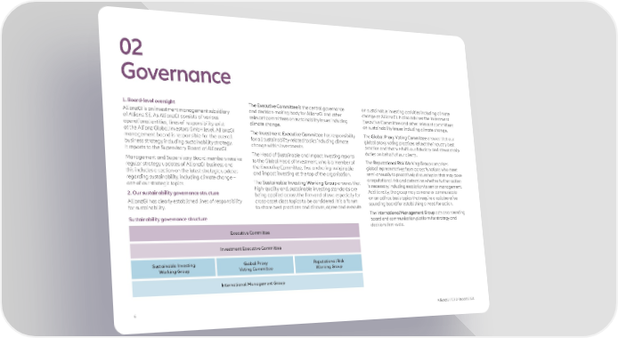 02 Governance 1. Board-level oversight The Executive Committee is the central governance on sustainable investing activities including climate AllianzGI is an investment management subsidiary and decision-making body for AllianzGI and other change at AllianzGI. It also advises the Investment of Allianz SE. As AllianzGI consists of various relevant committees on sustainability issues including Executive Committee and other relevant committees operational entities, lines of responsibility exist climate change. on sustainability issues including climate change. at the Allianz Global Investors GmbH level. AllianzGI The Investment Executive Committee has responsibility The Global Proxy Voting Committee ensures that our management board is responsible for the overall for all sustainability-related topics including climate global proxy voting practices reflect the industry best business strategy including sustainability strategy. change within investments. practice and that we fulfil our fiduciary and stewardship It reports to the Supervisory Board of AllianzGI. duties on behalf of our clients. Management and Supervisory Board members receive The Head of Sustainable and Impact Investing reports to the Global Head of Investment, who is a member of The Reputational Risk Working Group comprises regular strategy updates of AllianzGI business and the Executive Committee, thus anchoring sustainable global representatives from across functions who meet this includes a section on the latest strategic updates and impact investing at the top of the organisation. semi-annually to proactively discuss topics that may pose regarding sustainability, including climate change – a reputational risk and determine whether further action one of our strategic topics. The Sustainable Investing Working Group ensures that is necessary, including escalation to senior management. 2. Our sustainability governance structure high-quality and, sustainable investing standards are Additionally, the group may convene or communicate being applied across the firm and allows especially for on an ad hoc basis topics that require a collaborative AllianzGI has clearly established lines of responsibility cross-asset class topics to be considered. It is a forum sounding board for establishing a need for action. for sustainability. to share best practices and discuss, agree and execute The International Management Group acts as a sounding Sustainability governance structure board and communication platform for strategy and decisions firm-wide. Executive Committee Investment Executive Committee Sustainable Investing Global Proxy Reputational Risk Working Group Voting Committee Working Group International Management Group 6 AllianzGI TCFD Report 2021