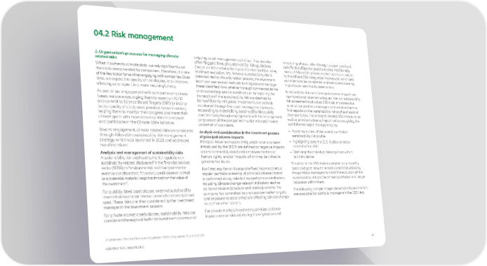 04.2 Risk management 2. Organisation’s processes for managing climate- ongoing asset management activities. They are also structuring phases, often through project- and fund- related risks often flagged through sustainability risks guidelines specific due diligence questionnaires. Additionally, When it comes to climate data, we rely significantly on (based on international best-practice standards) or using many of AllianzGI’s private market assets are subject the disclosure provided by companies. Therefore, it is one minimum exclusion lists. When a sustainability risk is to the Allianz ESG Integration Framework, which sets of the key topics for us when engaging with companies. Over detected during the origination process, the investment out criteria to be considered and met when investing time, we expect the quality of the disclosure to improve, team can use several methods to mitigate and manage in particular sensitive business areas. allowing us to report in a more meaningful way. these identified risks, whether through commercial terms Sustainability risks and principal adverse impacts are As part of our engagement with companies on climate or documenting specific conditions, or by rejecting the monitored and assessed using our internal sustainability issues, we are encouraging them to report on TCFD transaction if the sustainability risk are deemed to risk assessment tool called ESG Hub. It is accessible and commit to Science Based Targets (SBT) to lead to be insufficiently mitigated. Investments are actively to all of our portfolio managers, and enables them to better quality of disclosures provided to our investors, monitored through the asset management process, find reports on the sustainability risk profile of each of helping them to monitor their progress and meet their responding to materialising sustainability risks quickly their portfolios. These reports include ESG measures as climate goals with more accuracy. We also support and decisively through engagement with the management well as principal adverse impact indicators, giving the and participate in the Climate 100+ initiative. or sponsors of the companies in which AllianzGI invests portfolio managers transparency by: on behalf of our clients. Beyond engagement, climate-related risks are considered Analysis and consideration in the investment process – Providing a view of the overall portfolio’s through AllianzGI’s sustainability risk management of principal adverse impacts sustainability risk profile strategy, which was launched in 2021 and addresses Principal Adverse Impacts (PAI), which have also been – Highlighting potential E, S, G pillar or sector two dimensions: introduced by the SFDR are defined as negative impacts concentration risks Analysis and management of sustainability risks on environmental, social and employee matters or – Outlining the individual holdings from which A sustainability risk is defined by the EU regulation on human rights, and/or impacts which may be linked to tail risks derive 1 governance issues. sustainability-related disclosures in the financial services The data in the ESG Hub is updated on a monthly sector (SFDR) as “environmental, social or governance For listed equities and corporate fixed income assets, a basis and past reports remain accessible, allowing event or condition that, if it occurs, could cause an actual regular portfolio screening of principal adverse impact the portfolio managers to track the evolution of the or a potential material negative impact on the value of is performed along selected key performance indicators, sustainability risk profile of their portfolios and single the investment”. including climate change-relevant indicators, such as indicators within them. For publicly listed asset classes, external sustainability carbon emissions (absolute and relative), whether the The following sample images depict dashboards which research data and/or internal research and analysis are company has committed to any decarbonisation targets, are available for portfolio managers in the ESG Hub. used. These risks are then considered by the investment and exposure to sectors that are affecting climate change manager in the investment process. more than other sectors. For private market assets classes, sustainability risks are For private markets investments, principal adverse considered throughout both the investment process and impacts are considered during the origination and 1.Sustainable Finance Disclosure Regulation (SFDR) (Regulation (EU) 2019/2088) AllianzGI TCFD Report 2021 19