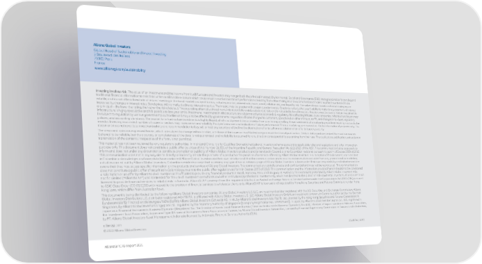 Allianz Global Investors Global Head of Sustainable and Impact Investing 3 Boulevard des Italiens 75002 Paris France www.allianzgi.com/sustainability Investing involves risk. The value of an investment and the income from it will fluctuate and investors may not get back the principal invested. Environmental, Social and Governance (ESG) strategies consider factors beyond traditional financial information to select securities or eliminate exposure which could result in relative investment performance deviating from other strategies or broad market benchmarks. Equities have tended to be volatile, and do not offer a fixed rate of return. Investing in the bond market is subject to risks, including market, interest rate, issuer, credit, inflation risk, and liquidity risk. The value of most bonds and bond strategies are impacted by changes in interest rates. Bond prices will normally decline as interest rates rise. The impact may be greater with longer-duration bonds. Credit risk reflects the issuer’s ability to make timely payments of interest or principal – the lower the rating, the higher the risk of default. "Incorporating alternative investments into a portfolio entails substantial risks and is not suitable for all investors. Investors must be aware that an investment in infrastructure is highly speculative and it is possible to lose your entire investment. Investments in Infrastructure are subject to adverse economic & regulatory risks affecting infrastructure companies. Infrastructure issuers may be subject to regulation by various governmental authorities and may also be affected by governmental regulation of rates charged to customers, operational or other mishaps, tariffs, and changes in tax laws, regulatory policies, and accounting standards. The market for infrastructure investments is highly illiquid, which could prevent the an investor from purchasing or selling these investments at an advantageous time resulting in a loss to the investor. Investing in a limited number of issuers or sectors may increase risk and volatility. Past performance is not indicative of future performance. This is a marketing communication. It is for informational purposes only. This document does not constitute investment advice or a recommendation to buy, sell or hold any security and shall not be deemed an offer to sell or a solicitation of an offer to buy any security. The views and opinions expressed herein, which are subject to change without notice, are those of the issuer or its affiliated companies at the time of publication. Certain data used are derived from various sources believed to be reliable, but the accuracy or completeness of the data is not guaranteed and no liability is assumed for any direct or consequential losses arising from their use. The duplication, publication, extraction or transmission of the contents, irrespective of the form, is not permitted. This material has not been reviewed by any regulatory authorities. In mainland China, it is for Qualified Domestic Institutional Investors scheme pursuant to applicable rules and regulations and is for information purpose only. This document does not constitute a public offer by virtue of Act Number 26.831 of the Argentine Republic and General Resolution No. 622/2013 of the NSC. This communication's sole purpose is to inform and does not under any circumstance constitute promotion or publicity of Allianz Global Investors products and/or services in Colombia or to Colombian residents pursuant to part 4 of Decree 2555 of 2010. This communication does not in any way aim to directly or indirectly initiate the purchase of a product or the provision of a service offered by Allianz Global Investors. Via reception of his document, each resident in Colombia acknowledges and accepts to have contacted Allianz Global Investors via their own initiative and that the communication under no circumstances does not arise from any promotional or marketing activities carried out by Allianz Global Investors. Colombian residents accept that accessing any type of social network page of Allianz Global Investors is done under their own responsibility and initiative and are aware that they may access specific information on the products and services of Allianz Global Investors. This communication is strictly private and confidential and may not be reproduced. This communication does not constitute a public offer of securities in Colombia pursuant to the public offer regulation set forth in Decree 2555 of 2010. This communication and the information provided herein should not be considered a solicitation or an offer by Allianz Global Investors or its affiliates to provide any financial products in Brazil, Panama, Peru, and Uruguay. In Australia, this material is presented by Allianz Global Investors Asia Pacific Limited (“AllianzGI AP”) and is intended for the use of investment consultants and other institutional/professional investors only, and is not directed to the public or individual retail investors. AllianzGI AP is not licensed to provide financial services to retail clients in Australia. AllianzGI AP is exempt from the requirement to hold an Australian Foreign Financial Service License under the Corporations Act 2001 (Cth) pursuant to ASIC Class Order (CO 03/1103) with respect to the provision of financial services to wholesale clients only. AllianzGI AP is licensed and regulated by Hong Kong Securities and Futures Commission under Hong Kong laws, which differ from Australian laws. This document is being distributed by the following Allianz Global Investors companies: Allianz Global Investors U.S. LLC, an investment adviser registered with the U.S. Securities and Exchange Commission; Allianz Global Investors Distributors LLC, distributor registered with FINRA, is affiliated with Allianz Global Investors U.S. LLC; Allianz Global Investors GmbH, an investment company in Germany, authorized by the German Bundesanstalt für Finanzdienstleistungsaufs