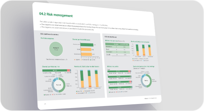 04.2 Risk management The below sample images depict dashboards which are available for portfolio managers in the ESG Hub. – The diagrams and statements below reflect the example inputs for shaping the portfolios. At any given time, other criteria may affect the investment strategy. – The diagrams and statements below are provided for illustrative purposes only. ESG dashboard overview ESG risk dashboard Portfolio snapshot Overall portfolio ESG score ESG tail risk overview (Score <=3) Portfolio E,S &G pillar distribution Absolute in % of PF value 1 Environment 7.20 0.8 Environment 2 0.64 0.6 91,762.77 Social 5.82 Social 6 8.1 0.4 tCO e 2 Governance 0 0.00 0.2 Governance 6.00 Overall 8 8.74 0 Environment Social Governance 0 1 2 3 4 5 6 7 8 9 10 Low 7-10 Moderate 3.01-6.99 Total financed emissions (Scope 1+2) High risk Moderate risk Low risk Substantial 0-3.00 Non rated Overall portfolio tail risk Portfolio E, S & G pillar risk distribution ESG tail risk profile Sector distribution of tail risky holdings 1 Total (based on PF weight) 88.22% 8.74% No tail risk (36) Tail risk (8) No-rated (8) 88.22% 8.74% 6.3% 1.0% 6.3% 1.0% 0.8 No tail risk (36) Tail risk (8) Non-rated (8) Consumer staples Others Consumer staples Others E 0.6 96.32% 3.04 9.5% 9.5% No tail risk (42) Tail risk (2) Non-rated (8) Industrials Industrials 0.4 S 50.2% 88.86% 8.10% Tail risk Materials Tail risk 50.2% 0.2 Materials No tail risk (38) Tail risk (6) Non-rated (8) 32.9% 0 G 32.9% Communication Environment Social Governance 96.96% 3.04 Communication serivices No tail risk (44) Tail risk (0) Non-rated (8) serivices Low 7-10 Moderate 3.01-6.99 No tail risk Tail risk Non-rated Substantial 0-3.00 Non rated No tail risk Tail risk Non-rated 20 AllianzGI TCFD Report 2021