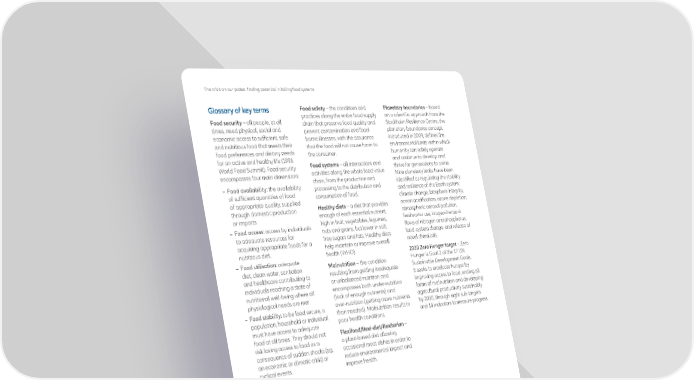 The crisis on our plates: finding potential in failing food systems Glossary of key terms Food safety – the conditions and Planetary boundaries – based practices along the entire food supply on a scientific approach from the Food security – all people, at all chain that preserve food quality and Stockholm Resilience Centre, the times, need physical, social and prevent contamination and food- planetary boundaries concept, economic access to sufficient, safe borne illnesses, with the assurance introduced in 2009, defines the and nutritious food that meets their that the food will not cause harm to environmental limits within which food preferences and dietary needs the consumer. humanity can safely operate for an active and healthy life (1996 and continue to develop and World Food Summit). Food security Food systems – all interactions and thrive for generations to come. encompasses four main dimensions: activities along the whole food value Nine planetary limits have been – Food availability: the availability chain, from the production and identified as regulating the stability processing to the distribution and and resilience of the Earth system: of sufficient quantities of food consumption of food. climate change, biosphere integrity, of appropriate quality, supplied ocean acidification, ozone depletion, through domestic production Healthy diets – a diet that provides or imports enough of each essential nutrient, atmospheric aerosol pollution, – Food access: access by individuals high in fruit, vegetables, legumes, freshwater use, biogeochemical nuts and grains, but lower in salt, flows of nitrogen and phosphorus, to adequate resources for free sugars and fats. Healthy diets land-system change, and release of acquiring appropriate foods for a help maintain or improve overall novel chemicals. nutritious diet. health (WHO). 2030 Zero Hunger target – Zero – Food utilisation: adequate Hunger is Goal 2 of the 17 UN diet, clean water, sanitation Malnutrition – the condition Sustainable Development Goals. and healthcare contributing to resulting from getting inadequate It seeks to eradicate hunger by individuals reaching a state of or unbalanced nutrition and improving access to food, ending all nutritional well-being where all encompasses both under-nutrition forms of malnutrition and developing physiological needs are met (lack of enough nutrients) and agricultural productivity sustainably – Food stability: to be food secure, a over-nutrition (getting more nutrients by 2030, through eight sub-targets population, household or individual than needed). Malnutrition results in and 14 indicators to measure progress. must have access to adequate poor health conditions. food at all times. They should not Flexifood/flexi-diet/flexitarian – risk losing access to food as a a plant-based diet allowing consequence of sudden shocks (eg, occasional meat dishes in order to an economic or climatic crisis) or reduce environmental impact and cyclical events. improve health. 6