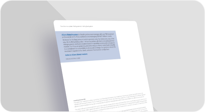The crisis on our plates: finding potential in failing food systems Allianz Global Investors is a leading active asset manager with over 700 investment professionals in 24 offices worldwide and managing EUR 637 billion in assets. We invest for the long term and seek to generate value for clients every step of the way. We do this by being active – in how we partner with clients and anticipate their changing needs, and build solutions based on capabilities across public and private markets. Our focus on protecting and enhancing our clients’ assets leads naturally to a commitment to sustainability to drive positive change. Our goal is to elevate the investment experience for clients, whatever their location or objectives. Active is: Allianz Global Investors Data as at 31 March 2022 Investing involves risk. The value of an investment and the income from it will fluctuate and investors may not get back the principal invested. Past performance is not indicative of future performance. This is a marketing communication. It is for informational purposes only. This document does not constitute investment advice or a recommendation to buy, sell or hold any security and shall not be deemed an offer to sell or a solicitation of an offer to buy any security. The views and opinions expressed herein, which are subject to change without notice, are those of the issuer or its affiliated companies at the time of publication. Certain data used are derived from various sources believed to be reliable, but the accuracy or completeness of the data is not guaranteed and no liability is assumed for any direct or consequential losses arising from their use. The duplication, publication, extraction or transmission of the contents, irrespective of the form, is not permitted. This material has not been reviewed by any regulatory authorities. In mainland China, it is for Qualified Domestic Institutional Investors scheme pursuant to applicable rules and regulations and is for information purpose only. This document does not constitute a public offer by virtue of Act Number 26.831 of the Argentine Republic and General Resolution No. 622/2013 of the NSC. This communication’s sole purpose is to inform and does not under any circumstance constitute promotion or publicity of Allianz Global Investors products and/or services in Colombia or to Colombian residents pursuant to part 4 of Decree 2555 of 2010. This communication does not in any way aim to directly or indirectly initiate the purchase of a product or the provision of a service offered by Allianz Global Investors. Via reception of his document, each resident in Colombia acknowledges and accepts to have contacted Allianz Global Investors via their own initiative and that the communication under no circumstances does not arise from any promotional or marketing activities carried out by Allianz Global Investors. Colombian residents accept that accessing any type of social network page of Allianz Global Investors is done under their own responsibility and initiative and are aware that they may access specific information on the products and services of Allianz Global Investors. This communication is strictly private and confidential and may not be reproduced. This communication does not constitute a public offer of securities in Colombia pursuant to the public offer regulation set forth in Decree 2555 of 2010. This communication and the information provided herein should not be considered a solicitation or an offer by Allianz Global Investors or its affiliates to provide any financial products in Brazil, Panama, Peru, and Uruguay. In Australia, this material is presented by Allianz Global Investors Asia Pacific Limited (“AllianzGI AP”) and is intended for the use of investment consultants and other institutional/professional investors only, and is not directed to the public or individual retail investors. AllianzGI AP is not licensed to provide financial services to retail clients in Australia. AllianzGI AP is exempt from the requirement to hold an Australian Foreign Financial Service License under the Corporations Act 2001 (Cth) pursuant to ASIC Class Order (CO 03/1103) with respect to the provision of financial services to wholesale clients only. AllianzGI AP is licensed and regulated by Hong Kong Securities and Futures Commission under Hong Kong laws, which differ from Australian laws. This document is being distributed by the following Allianz Global Investors companies: Allianz Global Investors U.S. LLC, an investment adviser registered with the U.S. Securities and Exchange Commission; Allianz Global Investors Distributors LLC, distributor registered with FINRA, is affiliated with Allianz Global Investors U.S. LLC; Allianz Global Investors GmbH, an investment company in Germany, authorized by the German Bundesanstalt für Finanzdienstleistungsaufsicht (BaFin); Allianz Global Investors (Schweiz) AG; in HK, by Allianz Global Investors Asia Pacific Ltd., licensed by the Hong Kong Securities and Futures Commission; in Singapore, by Allianz Global Investors Singapore Ltd., regulated by the Monetary Authority of Singapore [Company Registration No. 199907169Z]; in Japan, by Allianz Global Investors Japan Co., Ltd., registered in Japan as a Financial Instruments Business Operator [Registered No. The Director of Kanto Local Finance Bureau (Financial Instruments Business Operator), No. 424], Member of Japan Investment Advisers Association, the Investment Trust Association, Japan and Type II Financial Instruments Firms Association; in Taiwan, by Allianz Global Investors Taiwan Ltd., licensed by Financial Supervisory Commission in Taiwan; and in Indonesia, by PT. Allianz Global Investors Asset Management Indonesia licensed by Indonesia Financial Services Authority (OJK). © 2022 Allianz Global Investors 2201263 | 6174