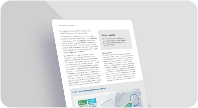 Unlocking the “S” in capitalism their approach to labour relations or consider more holistically their impact on local communities. But we know there is more that we – and the industry – Vaccine inequality can do. By making inclusive capitalism our third sustainability For every 100 people, around 68 vaccines research theme, we are granting proper resources and were administered in Europe and Northern efforts to identify emerging issues, driving awareness and America, compared with fewer than two in creating change. With the interdependencies of social, 16 climate change and environment, we will be able to address sub-Saharan Africa. this topic alongside our other two thematic pillars: climate change and planetary boundaries. Our analysis in framing and structuring inclusive Urgent next steps capitalism led us to distinguish life essentials and The world must take its lessons from the pandemic that livelihood essentials. We also believe that inequalities revealed the need for a shift of our economic and societal and exclusions deserve the same level of attention, as model. Global leaders are setting the tone by addressing exclusions are generally the consequence of inequalities social topics. The planned introduction in 2022 by the that have been stretched beyond their tipping point, EU of a Social Taxonomy, the social dimension of US including by the pandemic. This focus will likely lead President Joe Biden’s infrastructure plan, and China’s focus to product innovation, including new impact-focused on “common prosperity” are strong signs that the tide is investment strategies. It will also inform proxy-voting turning. We see this as the right moment to take an active decisions and define themed engagement projects, stance on inclusive capitalism alongside climate change which is a proven tool for increasing awareness among and the environment. These interwoven priorities, while corporations. Concerted actions via joint initiatives, representing the biggest challenges facing our planet, including the UN Principles for Responsible Investing, unlock new opportunities for investors to support the 15 transition to a more inclusive and sustainable world. will continue to be another lever to drive change. Exhibit 4: AllianzGI framework for inclusive capitalism Inclusion F airness , f Life Livelihood e a v i i r s Essentials Essentials u a s l n e ri e c d d n u o n B Education ry i s Food a t u e n n a s Health Decent work Pl A at Energy Infrastructure bani Clean air Financial el Water services dlrow apitalism e C B Inclusiv l u a s i n n o e i s t r e s v i i t a D y s e N s People G ties Life Essentials lob Diversity uni e a m g l n m a o h C C e t a m i l apitalism C Inequalities e C Livelihood Essentials Inclusiv Exclusion 15. For example, we contributed to the UN PRI paper on Covid-19 recovery: Sustainable and inclusive: Covid-19 recovery and reform | Engagement guide | PRI (unpri.org)| PRI (unpri.org) 16. The Sustainable Development Goals (SDGs), 2021 | United Nations 6
