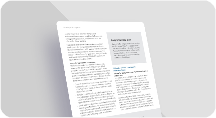 Unlocking the “S” in capitalism Another major driver is climate change. Local environmental resources are crucial for a high proportion of the poorest populations, and these resources are affected by global warming. Bridging the digital divide For instance, under the medium scenario for population Some 2.9 billion people remain offline globally – development, the Intergovernmental Panel on Climate equal to around 37% of the world population – Change estimates that at 1.5°C warming 178 million people – with 96% of them living in developing countries. including a high proportion of women, children and the Those who remain unconnected face multiple elderly – will be affected by water stress, drought intensity barriers, including a lack of access: some and habitat degradation by 2050. At 2°C warming this 390 million people are not even covered by a figure rises to 220 million people.6 7 mobile broadband signal. Inequality is a problem for everyone The Covid-19 pandemic is the most obvious recent example of a global crisis that has brought global inequality into stark relief. But think about the recent Shifting the economic model towards financial crises and increasingly regular extreme weather inclusive capitalism events. Inequalities undermine our capacity as a society It is time for society and economy to move to an inclusive to mitigate and overcome the impact of major crises like and fair world these, and as such they are a concern for everyone: A persistent, decades-long rise in gross domestic product – Covid-19 showed how the economy relies on global and (GDP) in many countries has increased overall living tight supply chains and exposed the lack of resilience standards and lifted many people out of poverty. This in the “just in time” model. Broken and delayed supply is proof of the power of capitalism. However, measuring chains affect everyone. GDP has its limitations. It cannot shed light on unequal – Consider the repercussion of a dock workers’ strike on income distribution. Nor does GDP give any insight into the global supply of goods. Or the effect on the price we other types of societal inequality – including less access to would have to pay if the “fair” cost of these goods was healthcare, education or infrastructure. applied that includes the social and environmental costs. According to the Allianz Global Wealth report, the richest – Sustained inequalities often result in heightened political 10% of the world’s population together owned more than or even geopolitical risks. This environment is typically 84% of total net financial assets in 2020, and the middle class 8 negative for economic growth, since it raises costs and is shrinking. And figures from the OECD show that median limits the availability of capital. In many regions of the incomes grew more slowly than top incomes since the mid- world, this has led to large-scale refugee crises. 1980s – and the Covid-19 pandemic made this trend worse. Exhibit 2: median incomes grow more slowly than top incomes Real disposable income growth by income position, average for 17 OECD countries, 1985 2016 (1985 = 100%) 170% Top 10% Median Bottom 20-40% Bottom 10% 160% 150% 140% 130% 120% 110% 100% 1985 1990 1995 2000 2005 2010 2015 Note: Unweighted average for 17 countries for which long-term data are available: Canada, Germany, Denmark, Finland, France, United Kingdom, Greece, Israel, Italy, Japan, Luxembourg, Mexico, Netherlands, Norway, New Zealand, Sweden and United States. Incomes are disposable incomes, corrected for household size. Source: Chapter 2, OECD calculations from OECD Income Distribution Database. Data as at April, 2019. StatLink Data 6. Summary for Policymakers – Special Report on Climate Change and Land (ipcc.ch) 7. Measuring digital development – Facts and figures 2021 (itu.int) 8. Allianz Global Wealth Report 2021 3